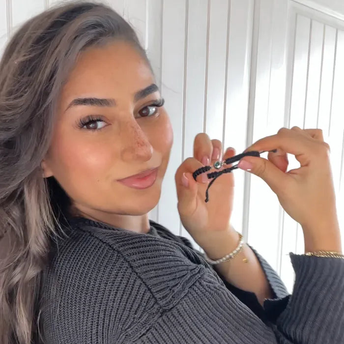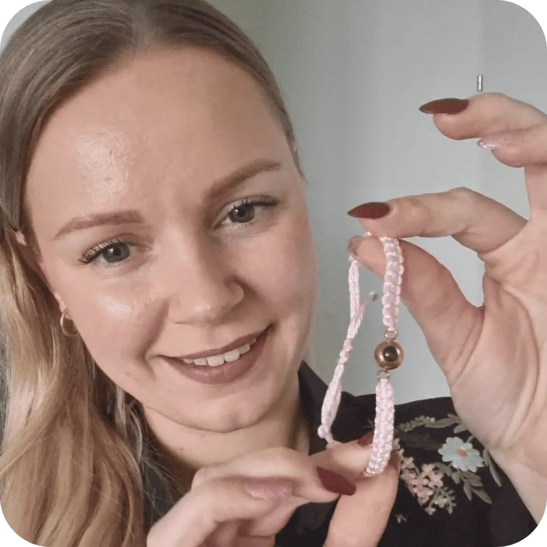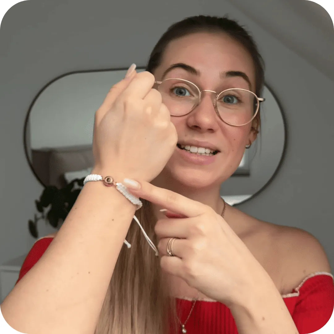 Tenez délicatement le bracelet tout près de vos yeux, comme si vous observiez le monde à travers une loupe magique. Prenez le temps de trouver le bon angle, ajustez doucement la distance… et laissez la lumière faire son œuvre.