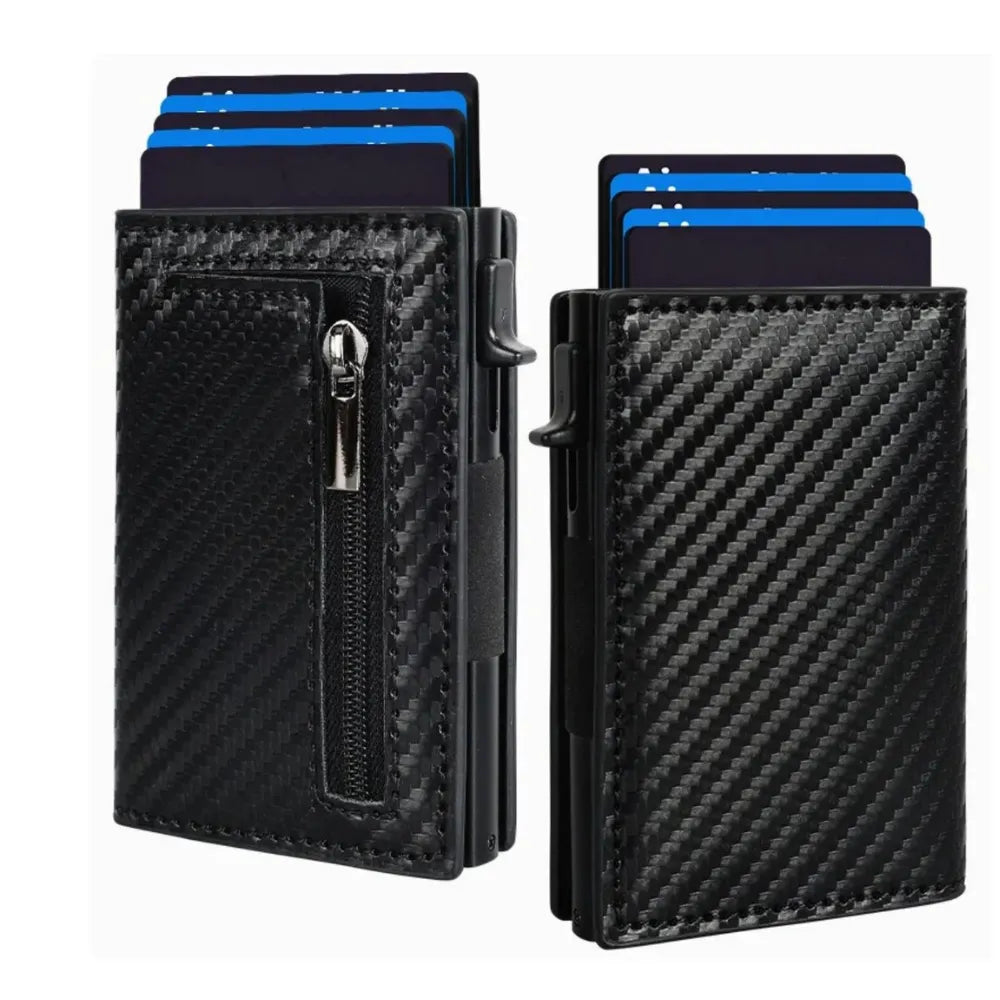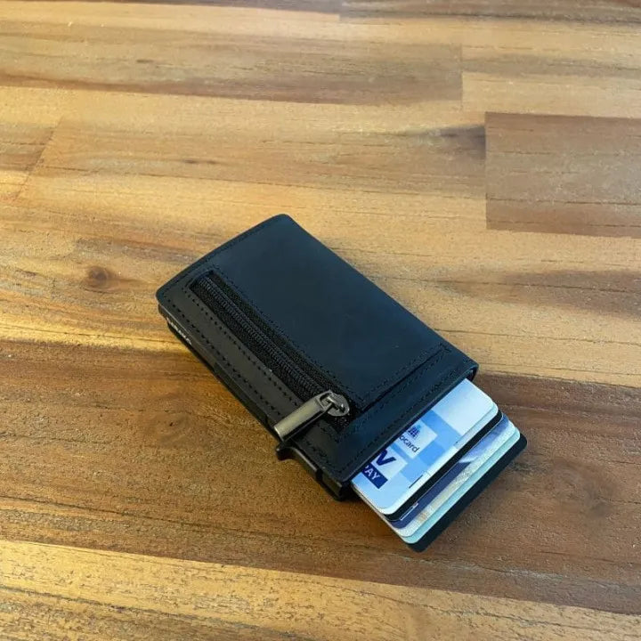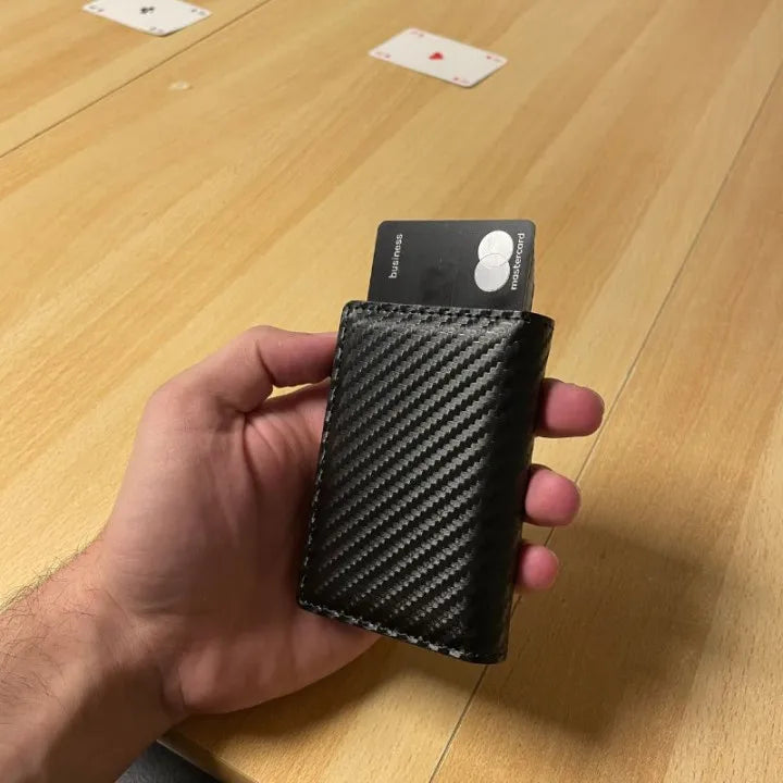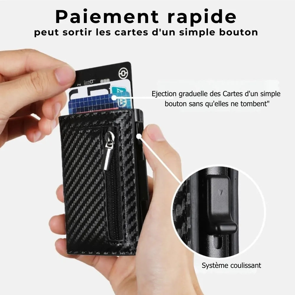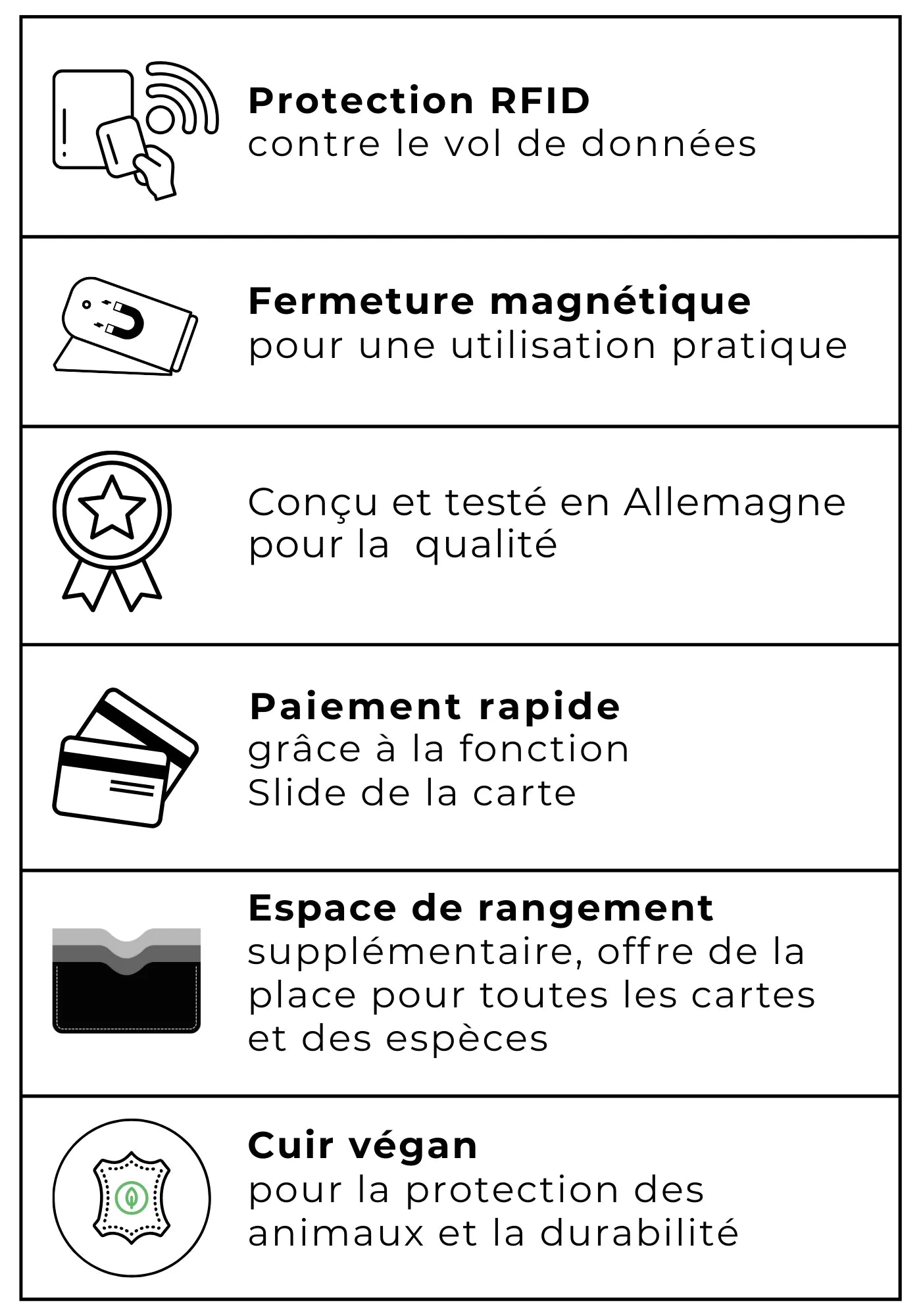 Grâce à notre système d'ouverture facile, accédez à toutes vos cartes d'un simple clic et ne craignez plus de les perdre. Le blocage RFID et NFC protège vos données contre le vol de données, car notre portefeuille bloque les fréquences de vos cartes.